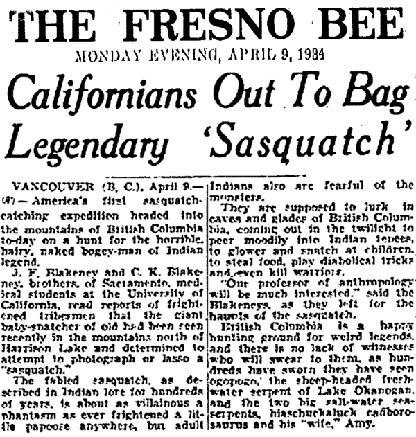 Vancouver, BC April 9, 1934 - America's first sasquatch-catching expedition headed into the mountains of British Columbia today on a hunt for the horrible hairy, naked bogey-man of Indian legend. J.F. Blakeney and C. K. Blakeney, brothers of Sacramento, medical students at the University of California, read reports of frightened tribesmen that the giant baby-snatcher of old had been seen recently in the mountains north of Harrison Lake and determined to attempt to photograph or lasso a "sasquatch." The fabled sasquatch as described in Indian lore for hundreds of years is about a villianous a phantasm as ever frightened a little papoose anywhere, but adult Indians also are fearful of the monsters. They are supposed to lurk in caves and glades of British Columbis, coming out in the twilight to peer moddily into Indian tepees to glower and snatch at children, to steal food, play diabolical tricks and even kill warriors. "Our professor of anthropology will be much interested," said the Blakeneys as they left for the hauois of the sasquatch. British Columbia is a happy hunting ground for weird legends and there is no lack of witnesses who will swear to them as hundreds have sworn they have seen ogopogo, the sheep-headed fresh water serpent of Lake Okanogan. The two big salt-water sea-serpents, hiaschuckaluck cadborosaurus and his "wife" Amy. Portions of this website are reprinted and sometimes edited to fit the standards of this website under the Fair Use Doctrine of International Copyright Law |